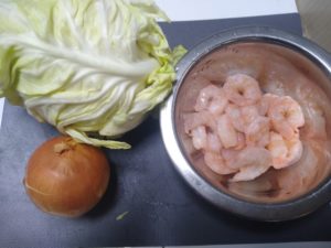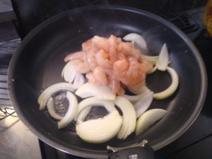 ③フライパンを簡単にふいて油大さじ1/2を熱し、エビと玉ねぎを1分ほど炒めます。