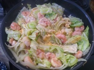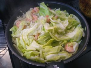 ④エビの色が変わったらキャベツを加え、強めの中火にして1分ほど炒める。