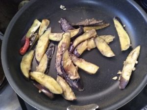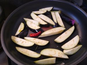 ③フライパンにオリーブ油大さじ2を熱し、唐辛子と茄子を強めに中火で炒める。