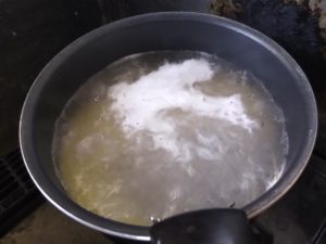 ⑤スパゲティが茹で上がったらゆで汁をカップ1/4をとりおいて湯を切ります。