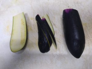②ナスはヘタを落として縦半分、斜め1cm幅に切ります。