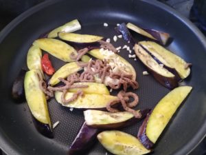 ③フライパンにオリーブ油大さじ2を熱し、唐辛子と茄子を強めに中火で炒める。