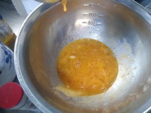 ①ボウルに卵を割って入れ、砂糖、はちみつ、シナモンを入れて混ぜます。