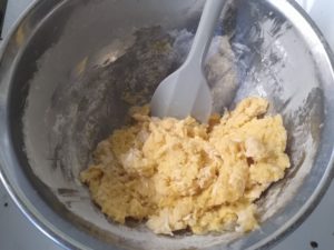 ②豆乳or牛乳、ホットケーキミックスを入れて混ぜます。