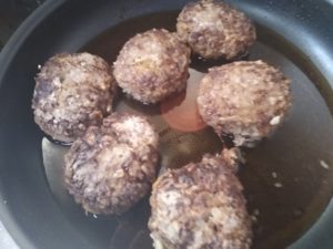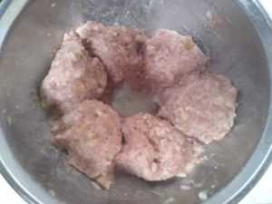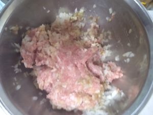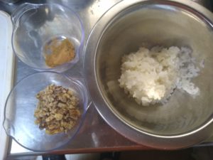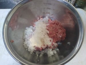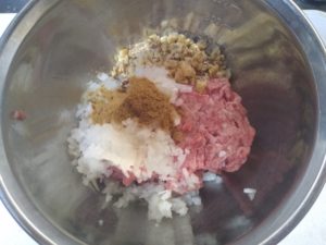 ①ボウルに牛ひき肉をいれ玉ねぎ、クミン、シナモン、くるみ、こしょう、ご飯(冷えてても良い)、ゆずこしょうを入れます。