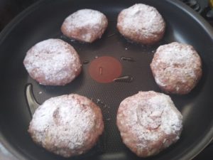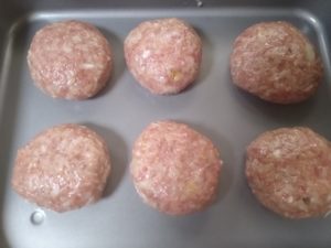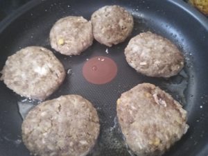 ④フライパンにサラダ油大さじ1熱し肉を入れて焼き色がつくまで2分間くらい中火で焼きます。