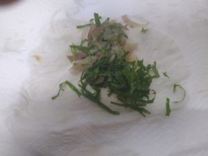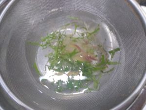 ⑧お皿に肉を盛って照り焼きをかけ薬味を乗せ完成です。