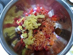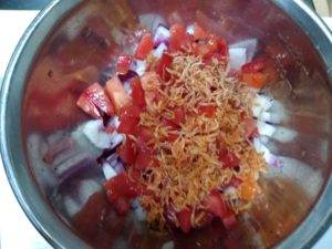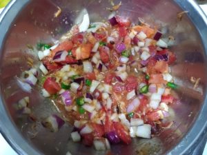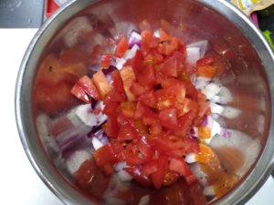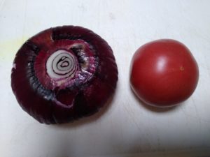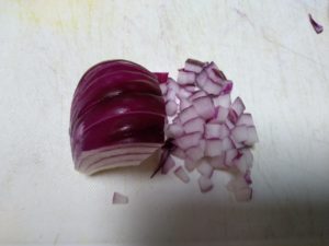 ①紫玉ねぎ、トマトを粗みじん切りにします。
