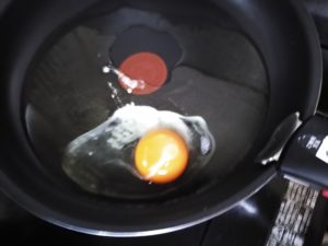 弱火で卵を揚げ焼気にします。(そうすることで白身がカリッと黄味がトロッとした感じになります)