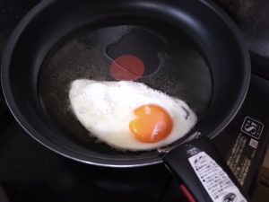 ⑤目玉焼きができてるのでお皿にもります。