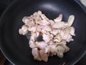 鶏もも肉を1.5cm角に切り、塩を振り炒めます。