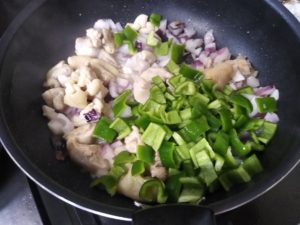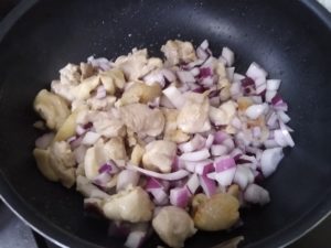 ③鶏肉が白くなってきたら1cm四方に切った紫玉ねぎ(普通の玉ねぎでも可)、ピーマンを入れます。
