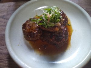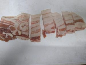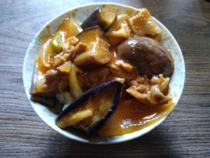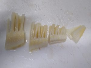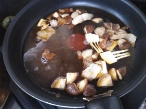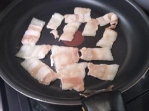 ④フライパンに油小さじ1熱して豚肉の両面を焼き色ついたら椎茸、タケノコを加えしんなりするまで炒める。