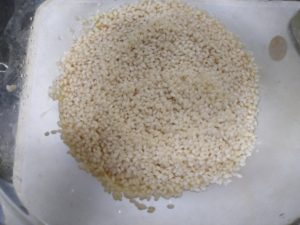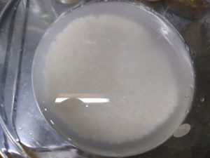 ⑦耐熱ボウルにもち米を入れ煮汁を温かいうちに入れて混ぜ、平らにする。