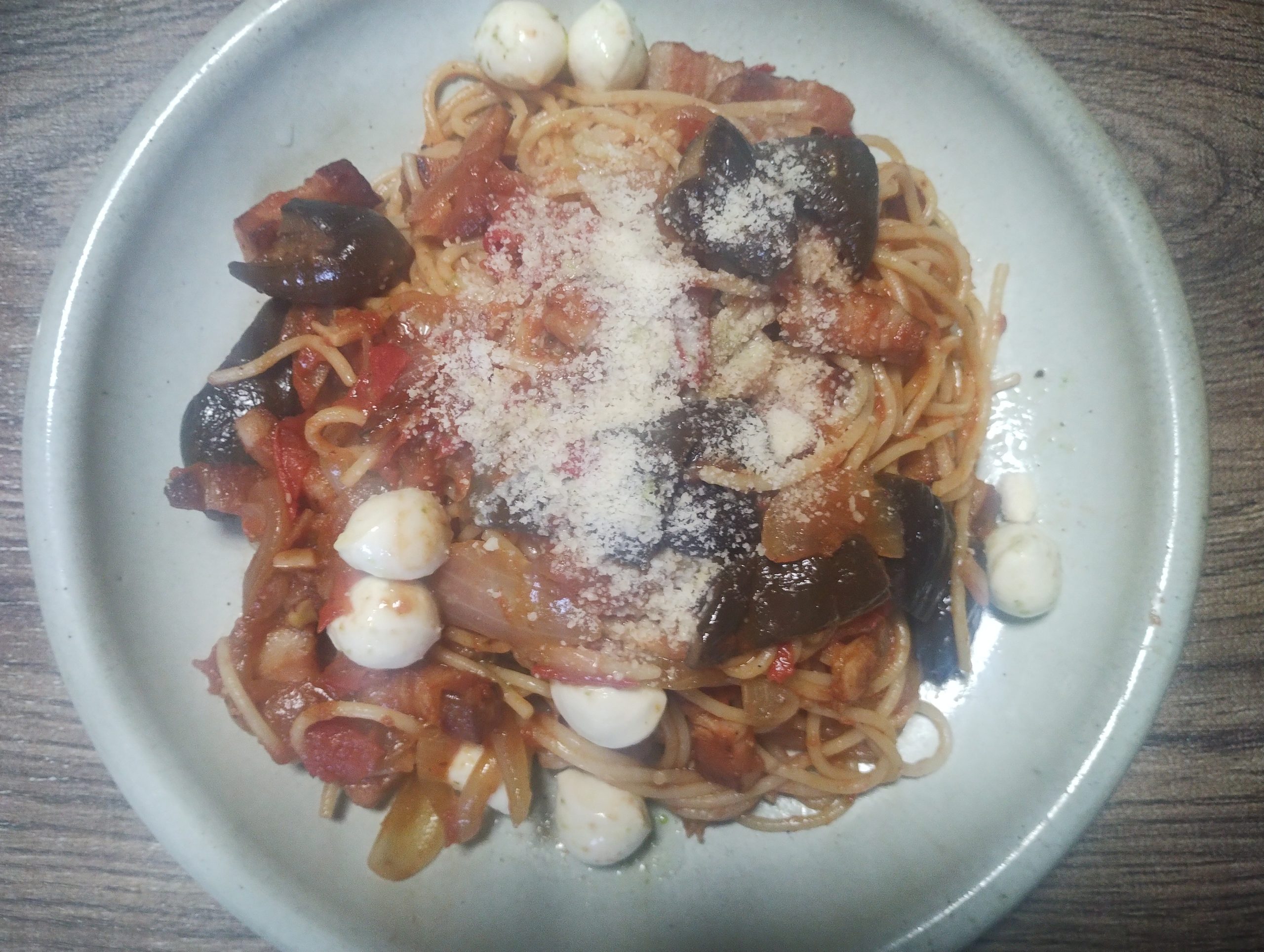 昨日は久しぶりにトマトを買ったので早速「ベーコンパスタ」。