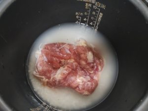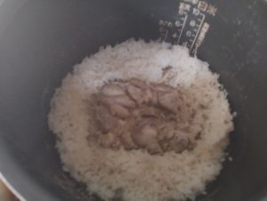 ③炊飯器に米、鶏がらスープの素、酒、塩、こしょう、しょうがorチューブを入れて、通常の水の加減まで水を加え混ぜて平らにならす。