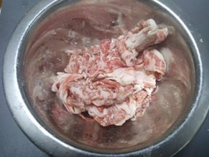 ①牛肉を(お酒、片栗粉各大さじ1)をボールに入れてもみこみます。