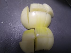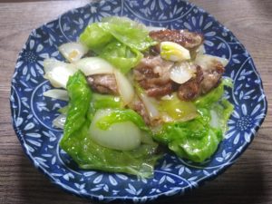 ②玉ねぎは一口大に切り、レタスも一口大にちぎっておきます。